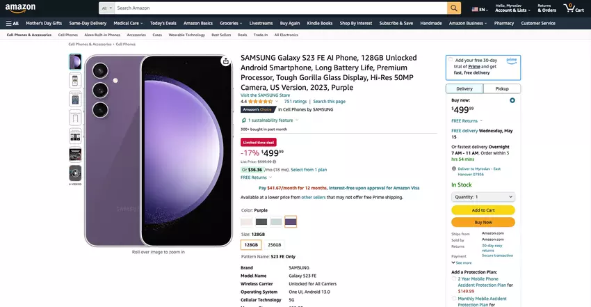 - Samsung Galaxy S23 FE, 256 GB (paars, crème, grafiet en mint) - $659.99.