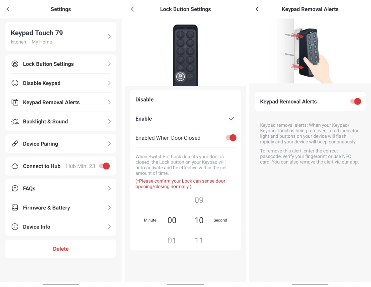 In de instellingen van de SwitchBot Keypad Touch kun je licht- en geluidswaarschuwingen regelen, de vergrendelknop activeren, het koppelen van het apparaat met het slot regelen of een alarm activeren wanneer de Keypad Touch uit de houder wordt gehaald.