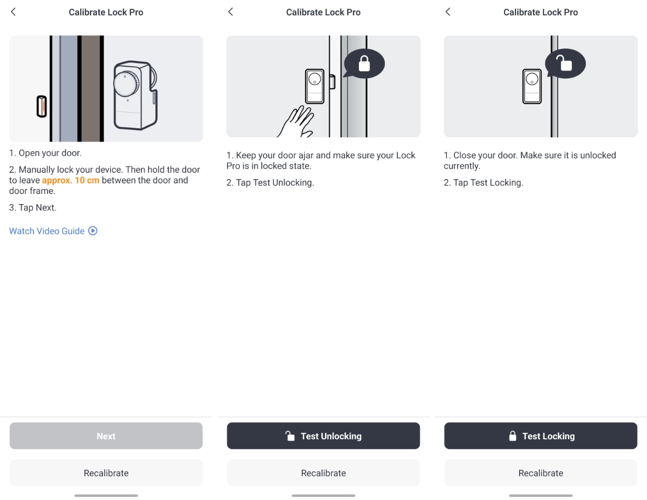 Kalibratie kan op elk moment opnieuw worden uitgevoerd vanuit de app. Ik had dit maar één keer nodig, na talloze experimenten met het slot, toen ik het slot geforceerd moest openen (ja, zo'n optie is er ook) vanaf de buitenkant van de deuren. Het kalibreren zelf is heel eenvoudig - de app vertelt je wat je moet doen en biedt zelfs een eenvoudige video als je de procedure niet aankunt. In feite bestaat het uit verschillende opeenvolgende stappen: je sluit de deuren en vergrendelt het slot met de hand. Dan open je het handmatig. Vervolgens open je de deuren met 10 centimeter en vergrendel je het slot opnieuw handmatig. Vervolgens ontgrendel je het slot met de app, sluit je de deuren en vergrendel je het slot met de app. Je vergrendelt/ontgrendelt het slot dus eerst handmatig en vervolgens vergrendel/ontgrendel je het met de app. Bij mij werkte het de eerste keer.
