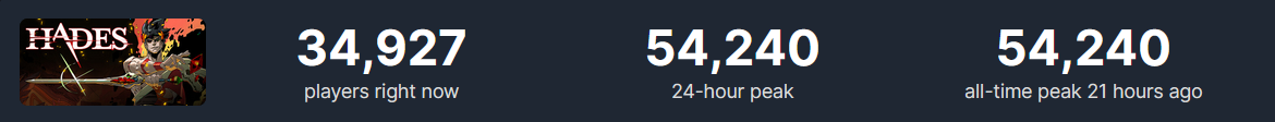 Op 12 mei heeft Hades zijn online piek bijgewerkt. Op dat moment probeerden 54 duizend spelers te ontsnappen uit het koninkrijk van Hades. Daarvoor was de online piek echter 38 duizend spelers. Dit aantal werd in 2020 vastgesteld.