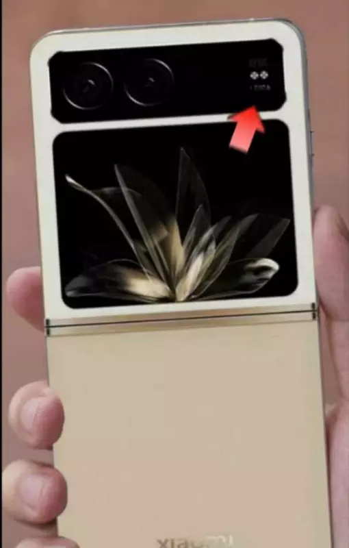 De smartphone Xiaomi MIX Flip heeft een interessant ontwerp gekregen. Zoals je op de onderstaande foto kunt zien, zijn aan de achterkant van het toestel horizontaal twee camera's geplaatst, met daarnaast twee LED-flitsers. Onder de camera bevindt zich een apart gedeelte voor het tweede scherm van het toestel. Onder de dubbele LED-flitseropstelling is het Leica-logo te zien.