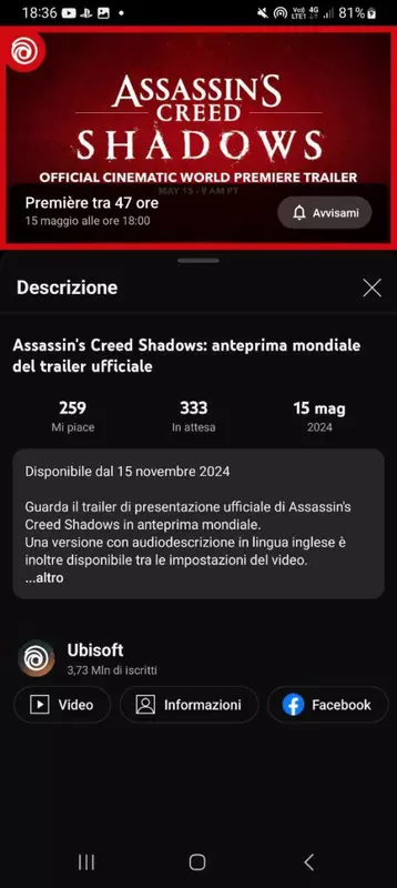 De releasedatum staat vermeld op het officiële YouTube-kanaal van Ubisoft in Italië onder de premièrevideo van Assassin's Creed Shadows op het tabblad homepage van de uitgever. Het is deze video die onbedoeld de details lijkt te hebben onthuld. Gebruiker X onder de nickname @Andreaalex2001 zag de datum en maakte snel een screenshot. De informatie is echter niet te zien op de Amerikaanse site.