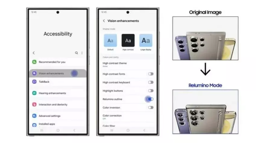 De Relumino Mode, die in januari 2023 werd geïntroduceerd, reproduceert inhoud op het scherm van de smartphone met een verhoogd contrast en helderheid om het toegankelijker te maken voor slechtzienden. Volgens Samsung verbetert deze technologie de scherpte van beelden en maakt het gemakkelijk om details op het scherm te onderscheiden, zodat gebruikers kunnen genieten van een verscheidenheid aan content, van sportevenementen tot nieuws.