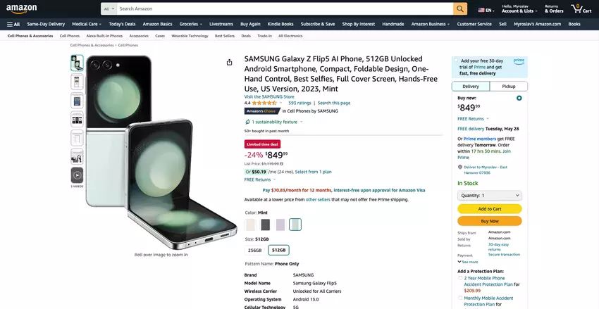 Samsung Galaxy Flip 5 op Amazon: opvouwbare smartphone met twee schermen, Snapdragon 8 Gen 2-chip en 512 GB geheugen voor 270 dollar korting