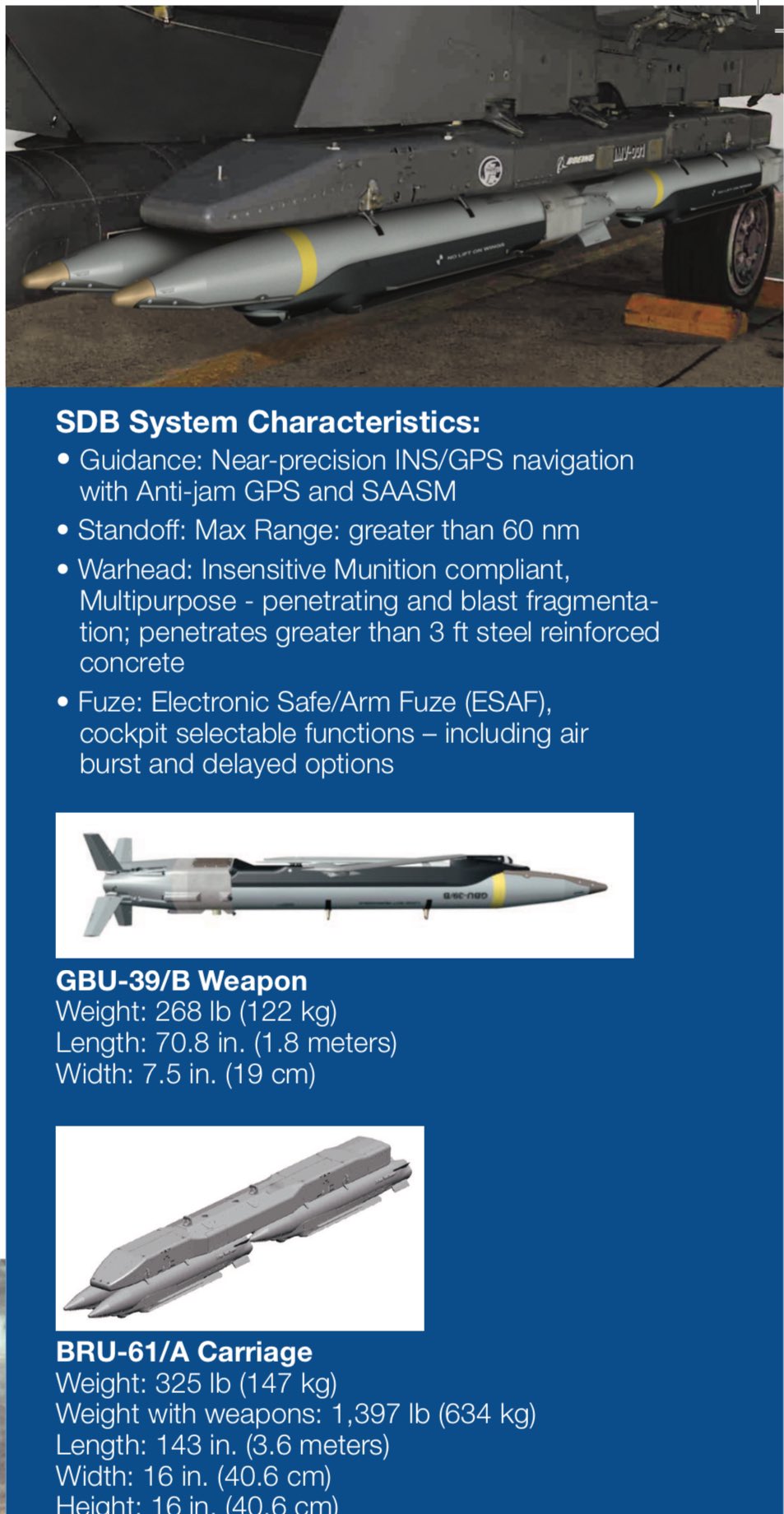 De GBU-39/B SDB is 1,8 meter lang en 19 cm breed. De bom met kleine diameter weegt 122 kg. Het maximale lanceerbereik is 110 kilometer, maar het is niet zeker dat Sovjetjagers dit kunnen halen.