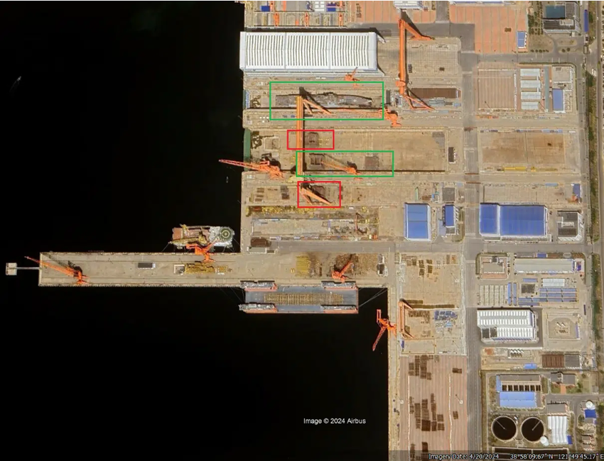 Volgens nieuwe commerciële satellietbeelden heeft het bedrijf ook een andere Type 052D destroyer neergelegd, de zesde van de laatste lichting op de scheepswerf. De balken voor de nieuwe modules - 18 en 20 meter - zijn ook te zien, wat duidt op parallelle bouw in hetzelfde dok.