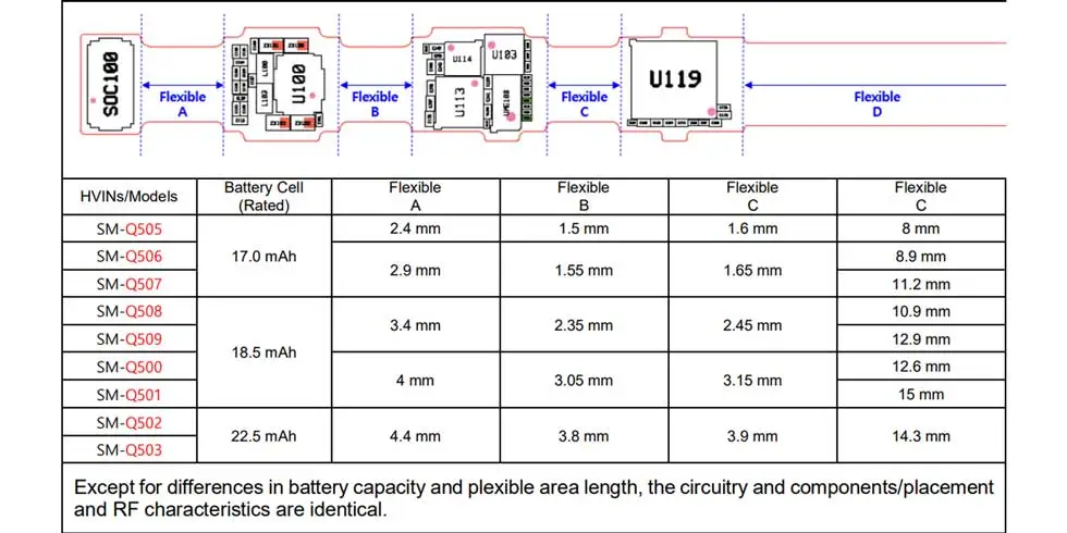 In het FCC dossier staan afbeeldingen van de ringen in verschillende maten, zodat je kunt zien hoe groot ze daadwerkelijk zijn. Elke maat heeft zijn eigen unieke modelnummer. Daarnaast tonen de documenten de batterijcapaciteit voor de verschillende formaten ringen, wat belangrijk is om te begrijpen hoe lang het apparaat meegaat.