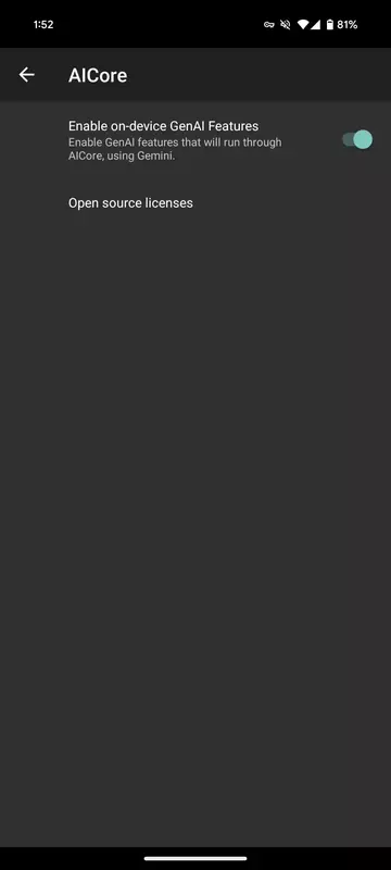 Na de update zijn de AICore-instellingen beschikbaar in de sectie Opties voor ontwikkelaars, Instellingen. Op deze pagina kun je GenAl-functies inschakelen die via AlCore zullen werken met behulp van Gemini.