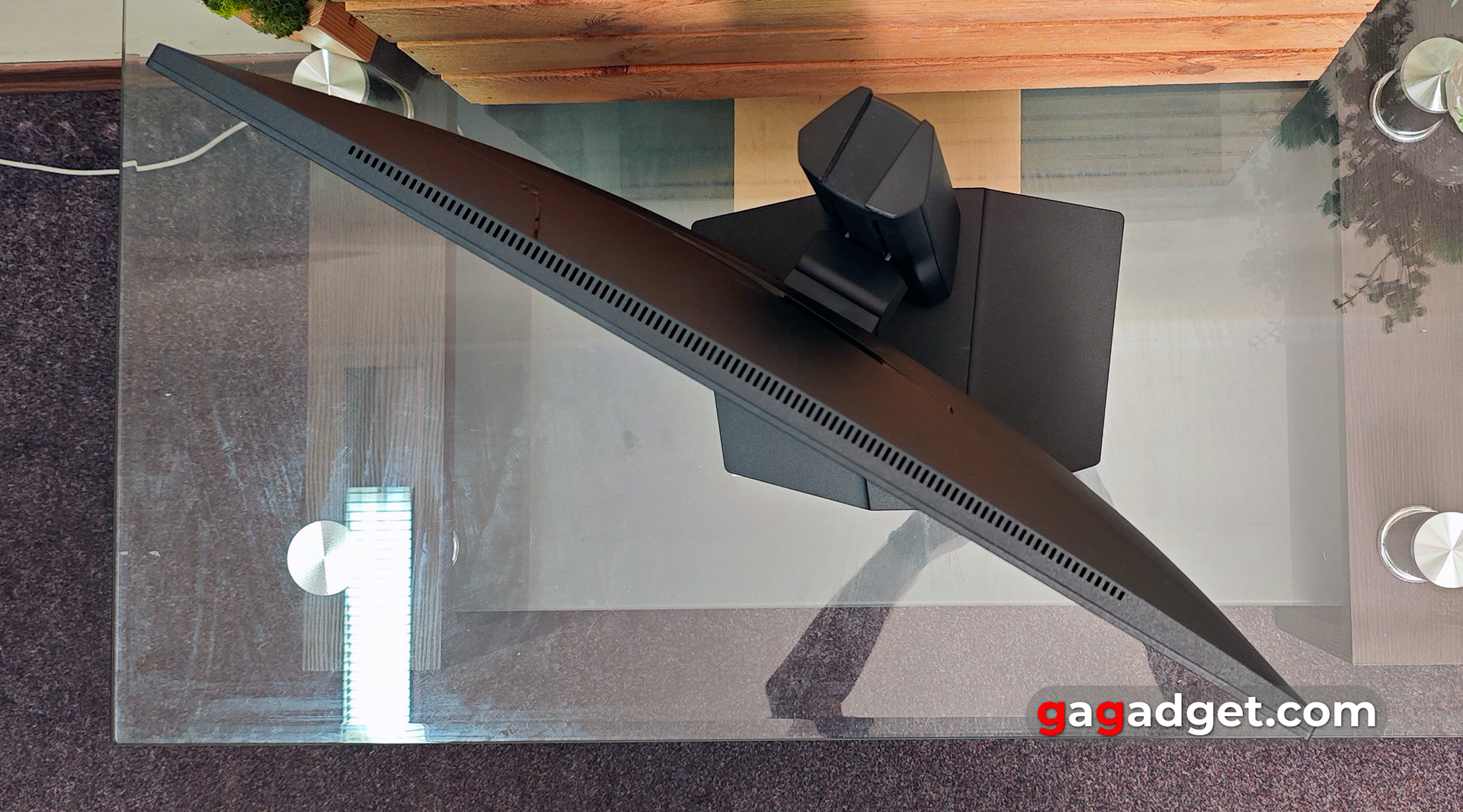 Het menu op het scherm heeft een typische logica met de instellingen verdeeld in secties. De eerste sectie, G.I. (Gaming Intelligence), bevat instellingen voor KVM, het dradenkruis op het scherm en lokale zoom van het gebied in het midden van het scherm. Het Gaming-gedeelte bevat een menu met videomodi, Night Vision (verlichting van donkere gebieden), A.I. Vision (herkenning van details in donkere gebieden en verhoging van helderheid en kleurverzadiging, werkt niet gelijktijdig met Night Vision), Adaptive Sync (adaptieve frequentie) en een wekker. Het gedeelte Professional bevat een modus voor kleurenweergave, een reductie van blauwe componenten, een functie voor beeldverbetering en een keuze voor het kleurengamma van het scherm. Het gedeelte Beeld bevat helderheid, contrast, kleurtemperatuur, enz. Het gedeelte Ingangsbron is verantwoordelijk voor het selecteren van de signaalbron: er kan automatisch of handmatig worden geschakeld. PIP/PBP - instellingen voor beeld-in-beeld modi. Navi Key (navigatietoets) - instellen van snelle functies voor de joystickverplaatsing. Instellingen - systeeminstellingen: menutaal en -transparantie, LED-indicatorinstellingen, achtergrondverlichting, HDMI CEC, reset, enz.