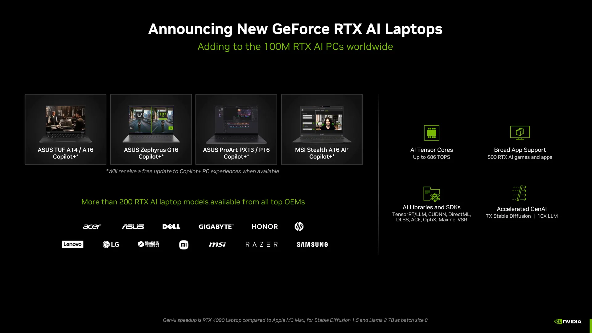Tijdens Computex liet Nvidia doorschemeren dat we binnenkort nieuwe laptopmodellen van Asus en MSI zullen zien die uitgerust zijn met deze geavanceerde functies. De nieuwe producten worden aangedreven door GeForce RTX 4070 GPU's en beloven energiezuinige oplossingen te bieden met ondersteuning voor Windows 11 AI PC. Naar verluidt worden deze laptops geleverd met de nieuwste AMD Strix-processors.