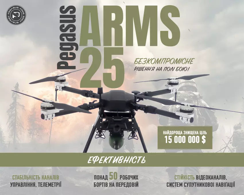 Er zijn nu overigens meer dan 50 Pegasus Arms 25 aan het front. De drone is er al in geslaagd om een doelwit ter waarde van 15.000.000 miljoen UAH te vernietigen.