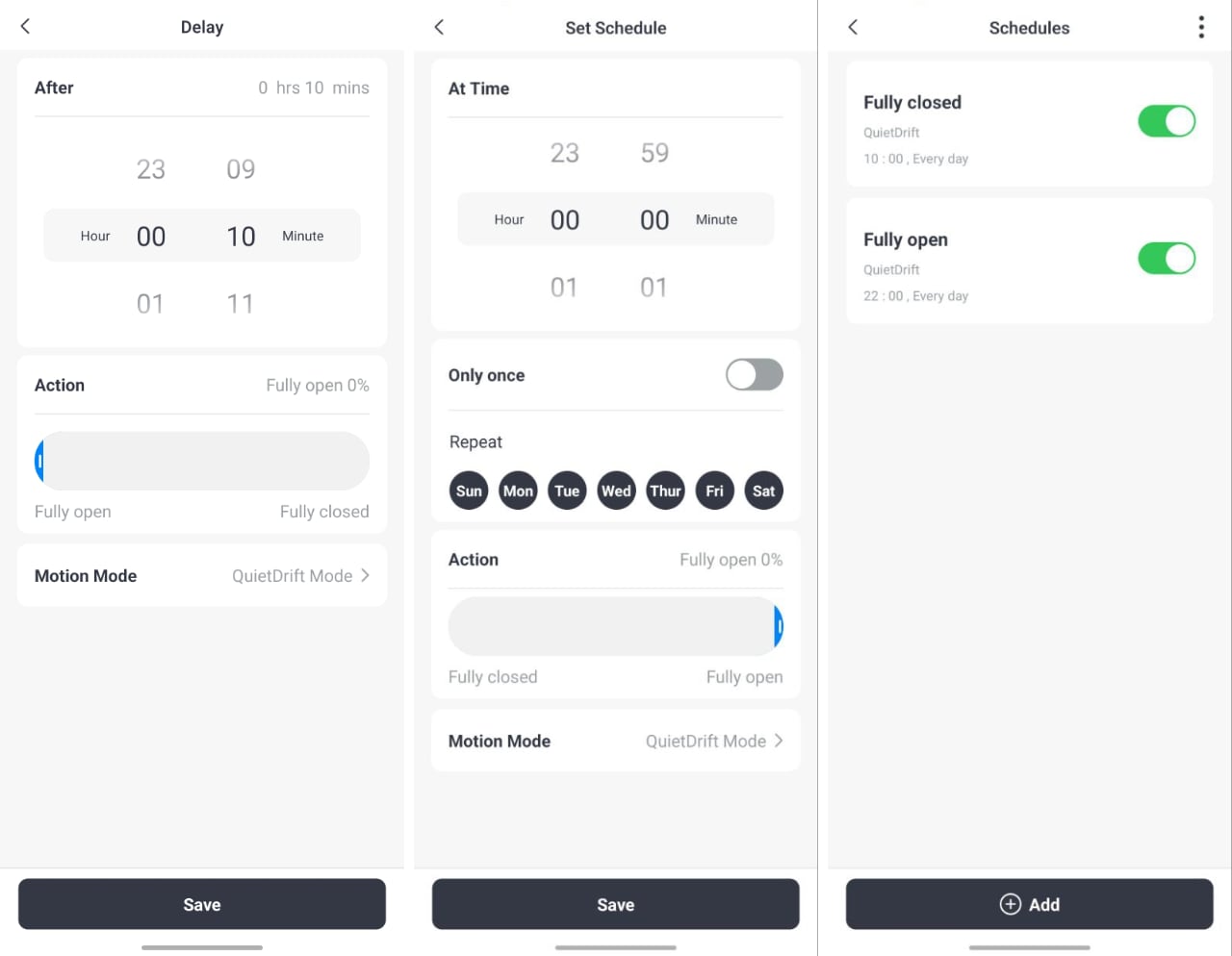 Het is mogelijk om een vertraging van de actie in te stellen (van een minuut tot een dag). Ik weet niet voor welke gevallen dit nuttig kan zijn (naar mijn mening is het beter om een schema te gebruiken), maar er is zo'n functie. Het schema biedt niet veel variabiliteit (waarom zou het - het is maar een gordijn). En het stelt je in staat om acties in te stellen met het gordijn - wanneer open, wanneer dicht, en je kunt het niet volledig doen, maar gedeeltelijk. Ik weet zeker dat 99% van de mensen zal doen wat ik doe - volledig open en volledig dicht in een bepaalde periode (nou ja, misschien een keer per seizoen zal ik aanpassen, rekening houdend met de lengte van de daglichturen). Maar hier hebben de ontwikkelaars toegang gegeven tot alles wat je met een chronometer kunt doen, twee soorten acties en wat discretie.