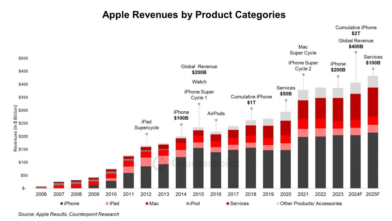 Dit recordbedrag zal worden bereikt dankzij de verkoop van iPhones en de diensten van Apple. Het bedrijf heeft in het derde kwartaal van 2024 al 84,78 miljard dollar verdiend. Het dienstensegment van Apple zal naar verwachting sneller groeien dan het hardwaresegment: de inkomsten uit diensten zullen in 2025 meer dan 100 miljard dollar bedragen.