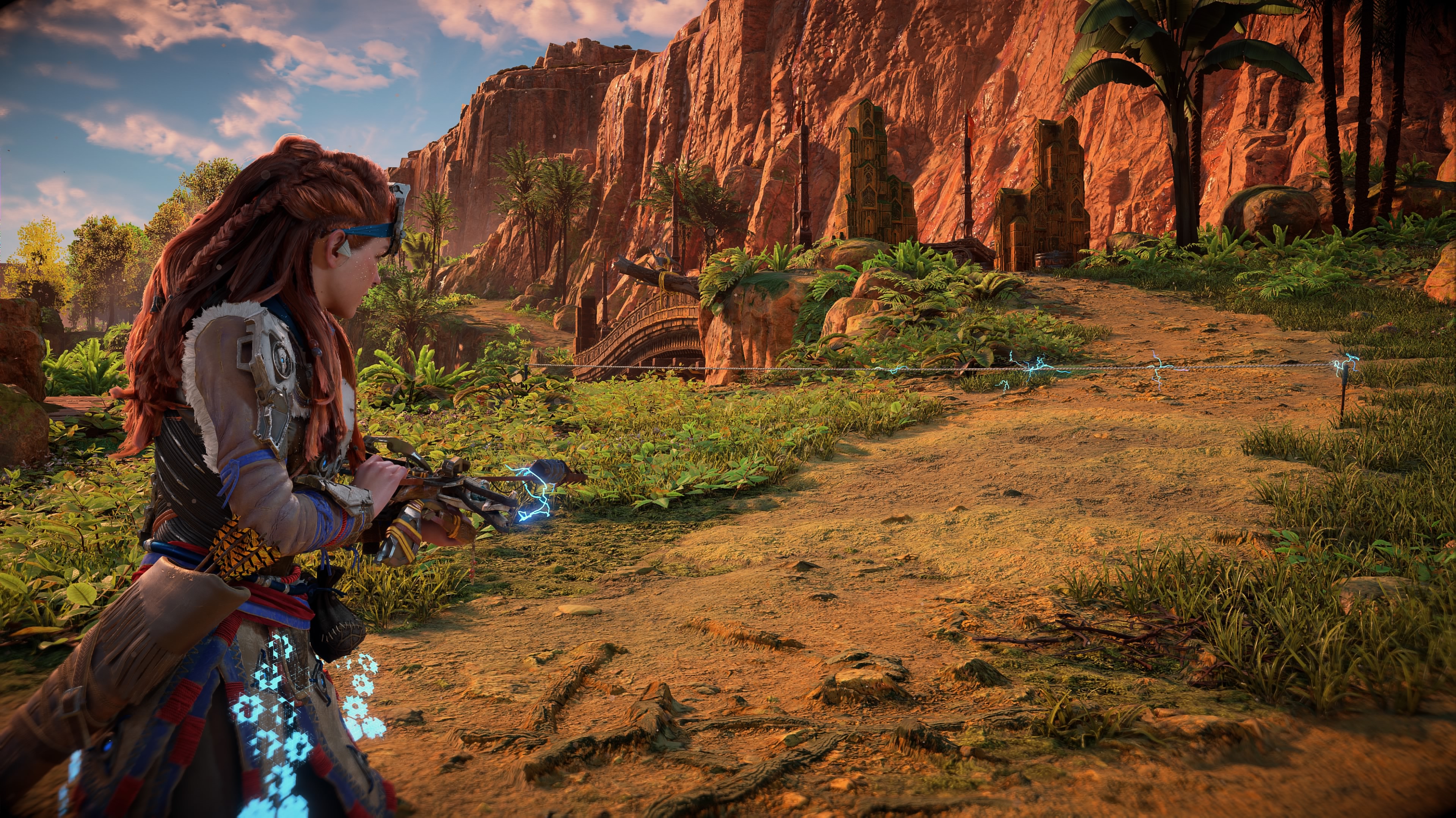 - Speer: Het belangrijkste wapen waarmee Aloy snelle slagen uitdeelt. Naast gewone slagen kan de speer worden gebruikt om machines te onderscheppen, waardoor je ze kunt besturen als transportmiddel om je door de wereld te verplaatsen (zoals een robo-paard).
