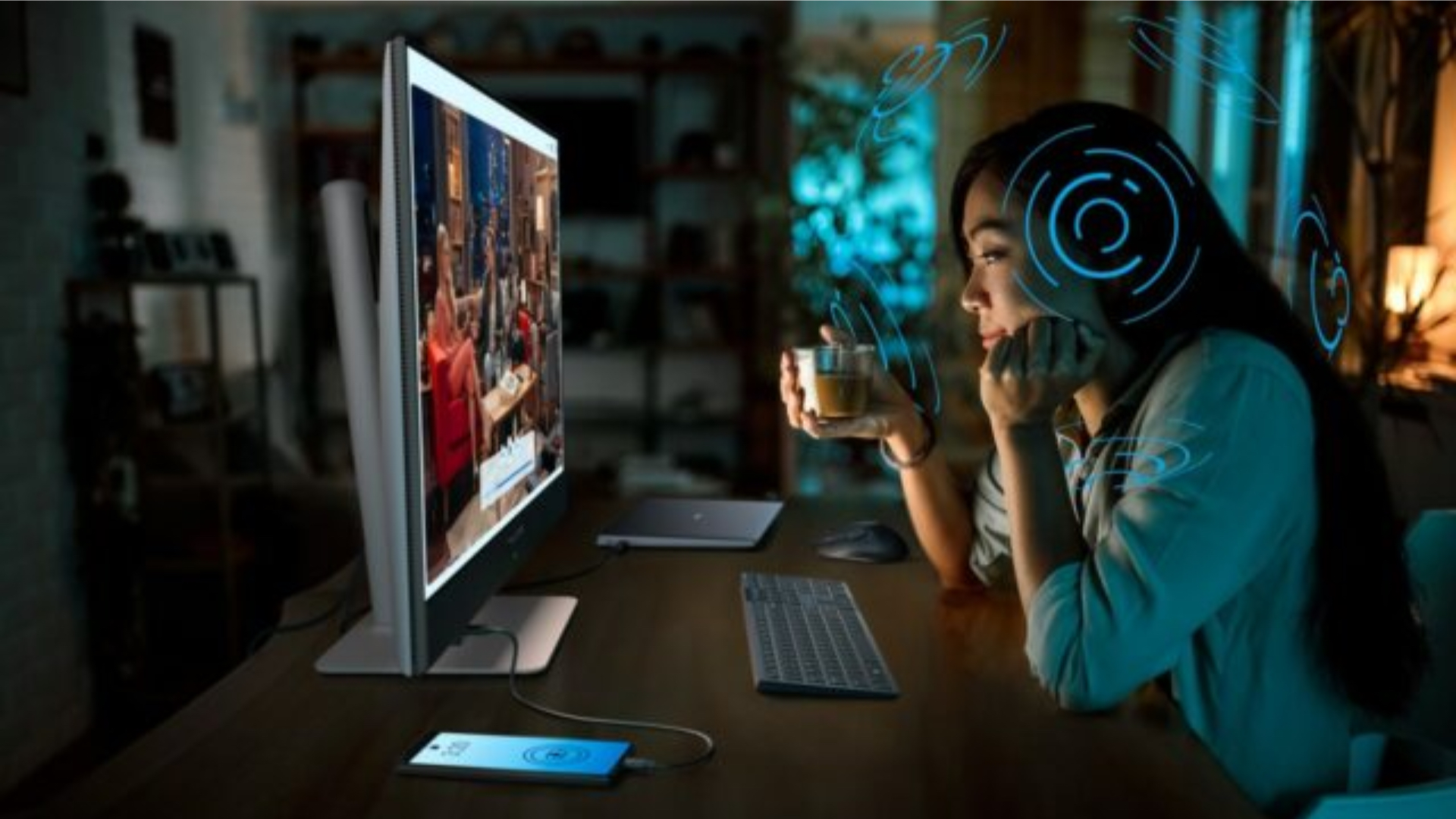 Het belangrijkste kenmerk van het apparaat is ondersteuning voor 3D Spatial Audio technologie. De monitor is uitgerust met een systeem van vijf 5×5W luidsprekers die een surround sound effect creëren. Deze functie is uniek omdat het geluid niet alleen de ruimte om je heen beslaat, waardoor het lijkt alsof het uit verschillende richtingen komt, maar zich ook aanpast aan de hoofdbewegingen van de gebruiker. Dankzij de ingebouwde sensoren en kunstmatige intelligentie krijgt de gebruiker het gevoel van volledige onderdompeling in geluid.