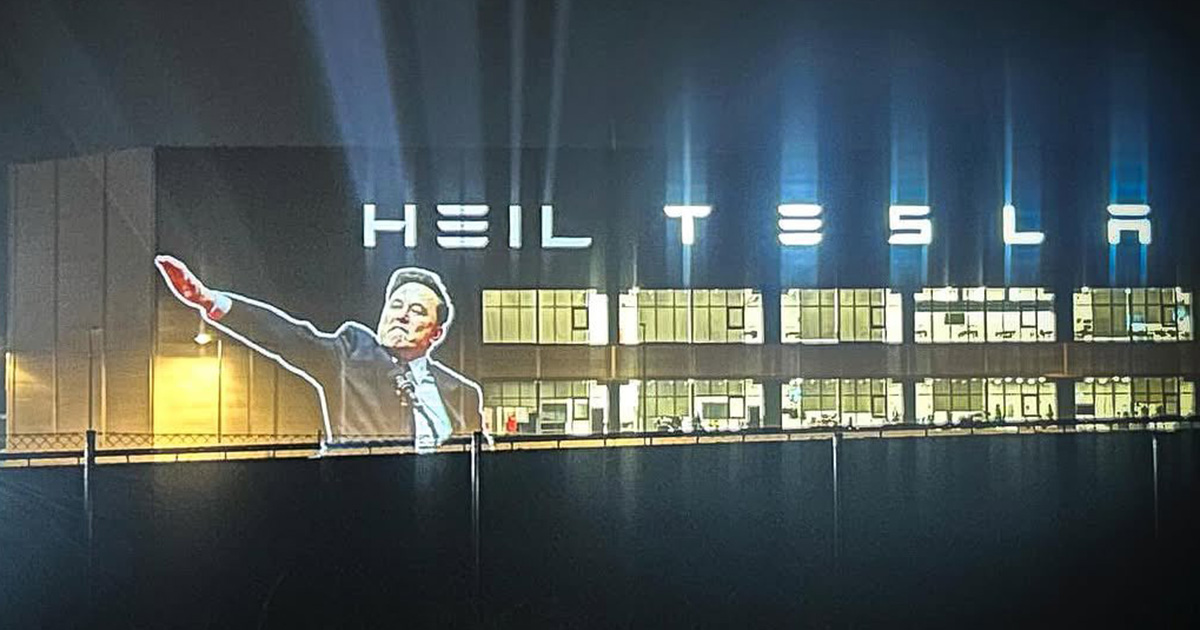 Op woensdagavond 22 januari toonden activisten met een projector een foto van miljardair en Tesla-eigenaar Elon Musk op de gevel van de elektrische autofabriek Tesla Gigafactory Berlin-Brandenburg in Grünheide, Duitsland. Op de foto, die werd genomen tijdens een toespraak in Washington na de inauguratie van de 47e Amerikaanse president Donald Trump, is te zien hoe Musk met zijn rechterhand een Hitlergroet brengt.