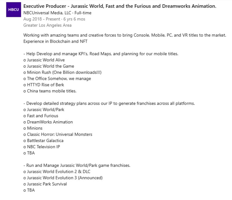 In het profiel van de uitvoerend producent van spelnieuwigheden Universal op Linkedln vonden oplettende gebruikers een vermelding van een nieuw project in het universum van Jurassic World.
