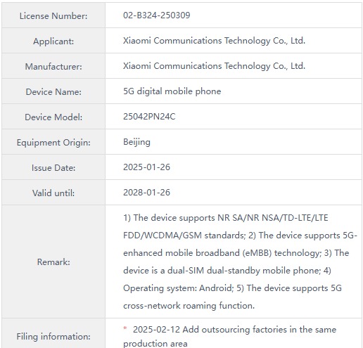 De Xiaomi 15s Pro met modelnummer 25042PN24C heeft licentie 02-B324-250309 gekregen en staat te boek als een 5G digitale mobiele telefoon. De MIIT-certificering is geldig tot 26 januari 2028. Het toestel ondersteunt 2G/3G/4G/5G netwerkconnectiviteit en is een dual-SIM mobiele telefoon met dual standby modus. Het toestel ondersteunt ook 5G eMBB-technologie en 5G inter-netwerk roaming.