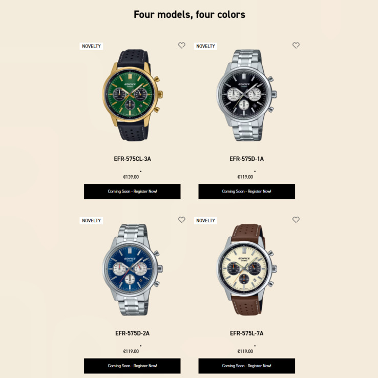 Casio bereidt de lancering voor van een nieuwe serie Edifice EFR-575-horloges in Europa. De EFR-575D-1A, EFR-575D-2A, EFR-575L-7A en EFR-575CL-3A modellen zijn al verschenen in de online winkels van het merk in verschillende Europese landen en zijn gemarkeerd als "Binnenkort verkrijgbaar".