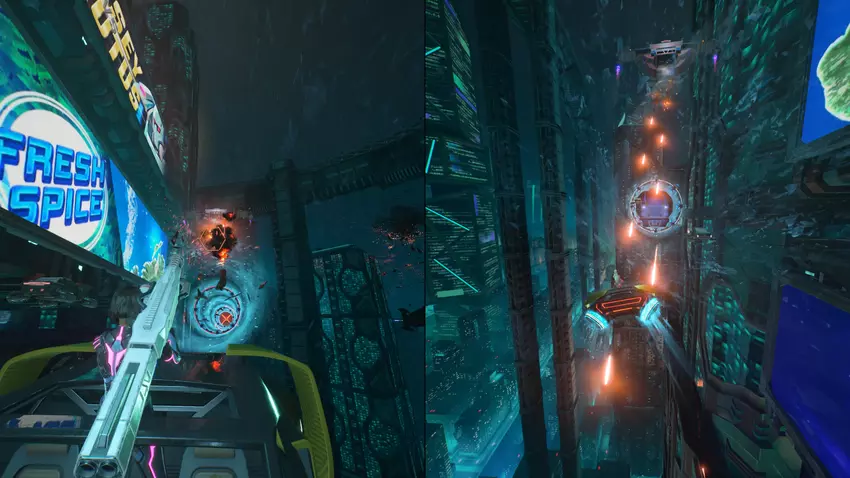 In Split Fiction verandert er altijd wel iets, zelfs binnen één hoofdstuk. Hier zijn we dan, een cyberninja in een enorme cyberpunkstad, maar we zullen niet de hele tijd alleen maar met zwaarden rondrennen. We moeten puzzels oplossen die spelen met de ruimte, waarbij interactie met elkaar het belangrijkste is. Vervolgens word je in een achtervolging gegooid, waarbij je politieauto's moet neerschieten, parkeren en slechteriken in mootjes moet hakken.