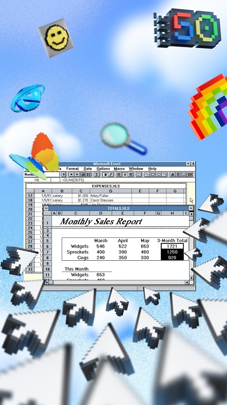 De wallpaper is gemaakt in de stijl van vier iconische Microsoft-programma's: Solitaire, Paint, Word en Excel, die elke Windows-gebruiker kent.