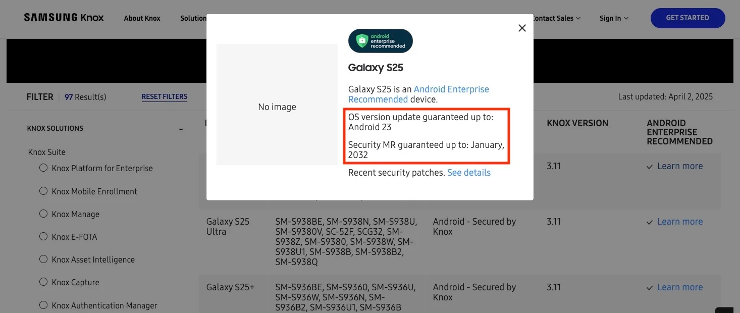 Zoals vermeld op de officiële website van Samsung heeft de Enterprise Edition traditioneel uitgebreide ondersteuning - het bedrijf biedt een extra jaar software-updates voor vlaggenschipmodellen in deze variant. Samsung garandeert ook dat de Galaxy S25 Enterprise Edition beveiligingsupdates zal ontvangen tot januari 2032.