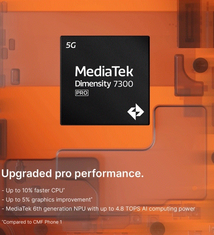 Dit is een verbeterde versie van de standaard Dimensity 7300 die werd gebruikt in de CMF Phone 1, dus verwacht geen drastische toename in prestaties, maar het bedrijf beweert dat de Pro-chip 10% sneller is als het gaat om CPU-prestaties en 5% efficiënter als het gaat om graphics.