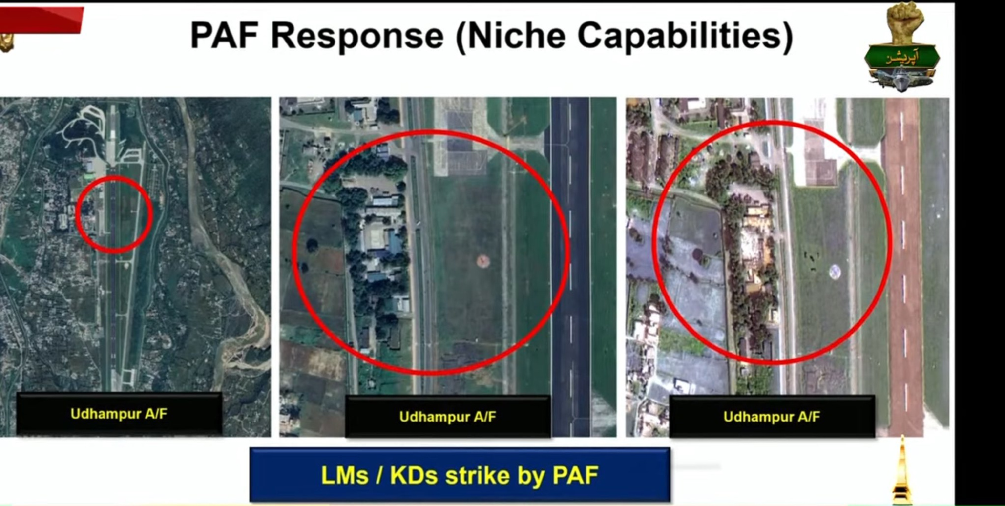 Tijdens zijn rapport over de doelwitten die zijn geraakt, toonde Aurangzeb satellietbeelden waarop de impact van de aanvallen op twee locaties op de luchtbasis te zien is. Als bewijs vergeleek hij deze beelden met die van vóór het begin van het conflict.