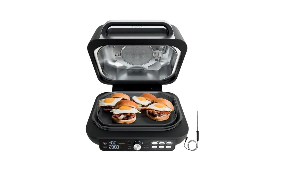 Ninja's IG651 combineert grillen binnenshuis met bakplaatfunctionaliteit en frituurmogelijkheden in één apparaat voor op het aanrecht. Het onafhankelijk aangedreven grillrooster bereikt een temperatuur van 500°F voor direct aanbraden op hoge temperatuur, wat niet mogelijk was op eerdere modellen die uitsluitend op cyclonale lucht vertrouwen. Een 12-inch vlakke bakplaat is gekoppeld aan het rooster, waardoor de bodemwarmte wordt benut voor pannenkoeken, eieren en andere gerechten die traditionele grills niet aankunnen. De Smart Cook System thermometer controleert de interne temperaturen op vier eiwitstanden en negen gaarheidsniveaus.