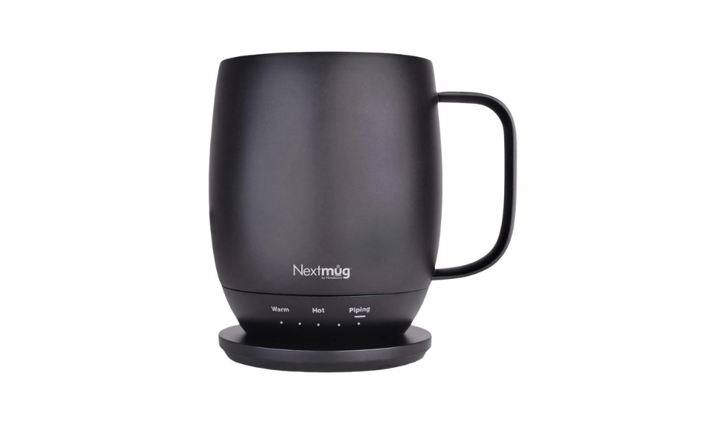 De Nextmug houdt dranken op de geselecteerde temperatuur door middel van een verwarmingselement op batterijen. De 14-ounce roestvrijstalen mok heeft een touch display die de huidige temperatuur en batterijstatus weergeeft. Het temperatuurbereik is instelbaar van 120°F tot 140°F in stappen van één graad. De batterij gaat ongeveer 2 uur mee als de warmte van de oplaadonderzetter wordt gehandhaafd. De meegeleverde draadloze oplaadbasis voorziet de mok van stroom als hij stilstaat. IPX5 waterbestendigheid maakt afspoelen onder de kraan mogelijk.
