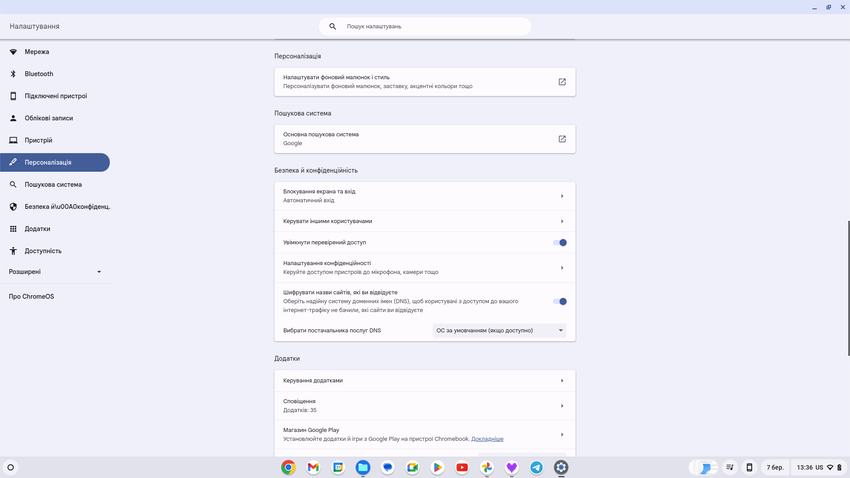 Over het algemeen lijken de logica en het uiterlijk van de interface op de gebruikelijke Windows desktop. We hebben een snelle launcher die desgewenst verborgen kan worden. Er is een menu met alle geïnstalleerde applicaties, een paneel voor snelle instellingen (helderheid, volume, draadloze interfaces, enz.), snelle toegang tot meldingen en de mogelijkheid om je Android-smartphone te koppelen aan een Chromebook en toegang te krijgen tot foto's, gesprekslogs en meer. Chrome OS ondersteunt het maken van verschillende desktops en het gebruik door meerdere gebruikers. De overgrote meerderheid van Android-apps werkt correct. Om apps te installeren die niet uit de Play Store komen, moet je echter overschakelen naar de ontwikkelaarsmodus.