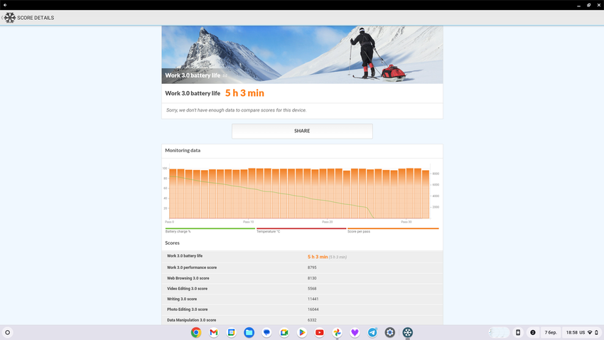 Acer geeft geen batterijspecificaties, maar belooft dat de Chromebook 314 tot 11,5 uur meegaat op een enkele lading. In de PCMark-test ging de laptop 5 uur mee. Maar tijdens de test was de helderheid van het scherm maximaal. Toen de helderheid werd verlaagd en films in cycli werden afgespeeld, ging de laptop iets langer mee dan 7 uur.
