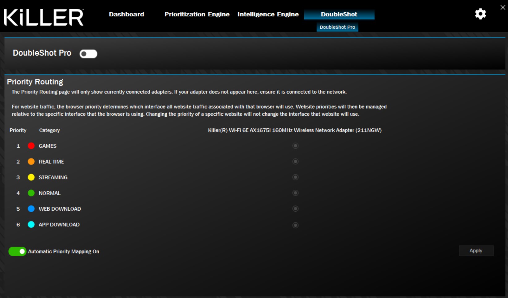 Killer Intelligence Centre is een toepassing voor het optimaliseren van de draadloze adapter, het prioriteren van bepaalde toepassingen en het monitoren van het signaal.