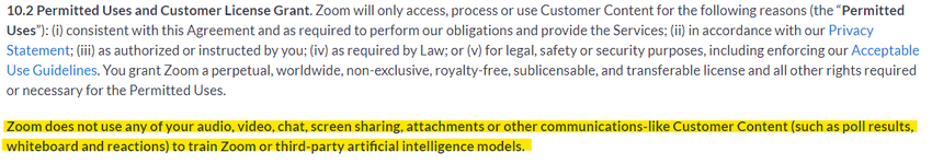Op 11 augustus verwijderde Zoom een clausule uit zijn servicevoorwaarden die sprak over het mogelijke gebruik van klantgegevens om algoritmes voor kunstmatige intelligentie te trainen.