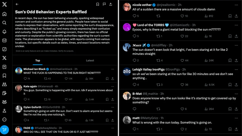 Grok publiceerde het nieuws dat het publiek "bezorgd is over het gebrek aan officiële verklaringen of uitleg van wetenschappelijke autoriteiten over de huidige staat van de zon". Dit is echter niet waar, aangezien wetenschappers de aard van zonsverduisteringen goed begrijpen.