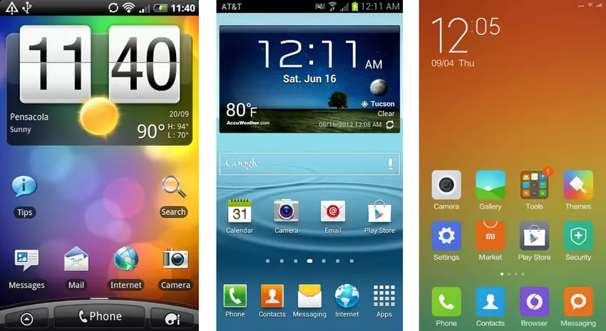 Merkschillen (van links naar rechts) HTC Sense, Samsung TouchWiz (nu OneUI) en Xiaomi MIUI