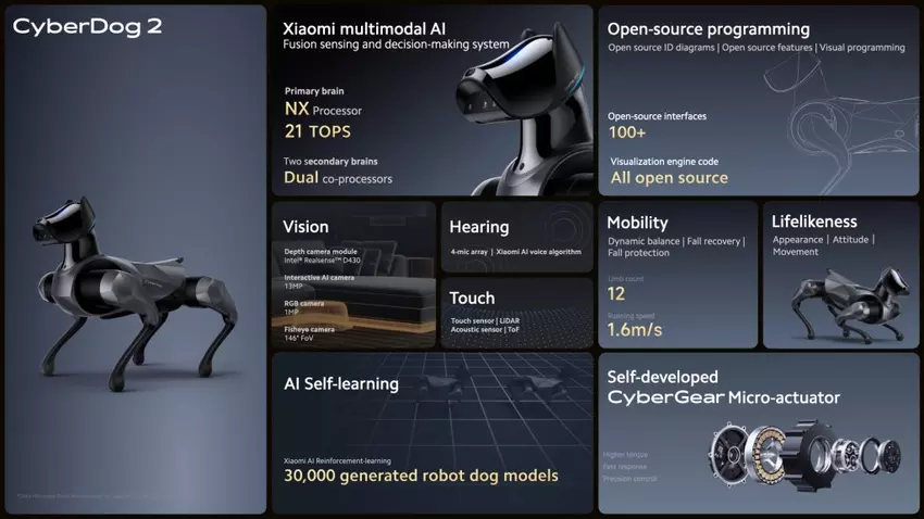 CyberDog 2 ziet eruit als een hond van het ras Doberman. Hij weegt 8,9 kg en is 36,7 cm hoog. Het bedrijf zegt dat de robot is uitgerust met Xiaomi's eigen CyberGear-actuators om een hoge mate van wendbaarheid te bieden.