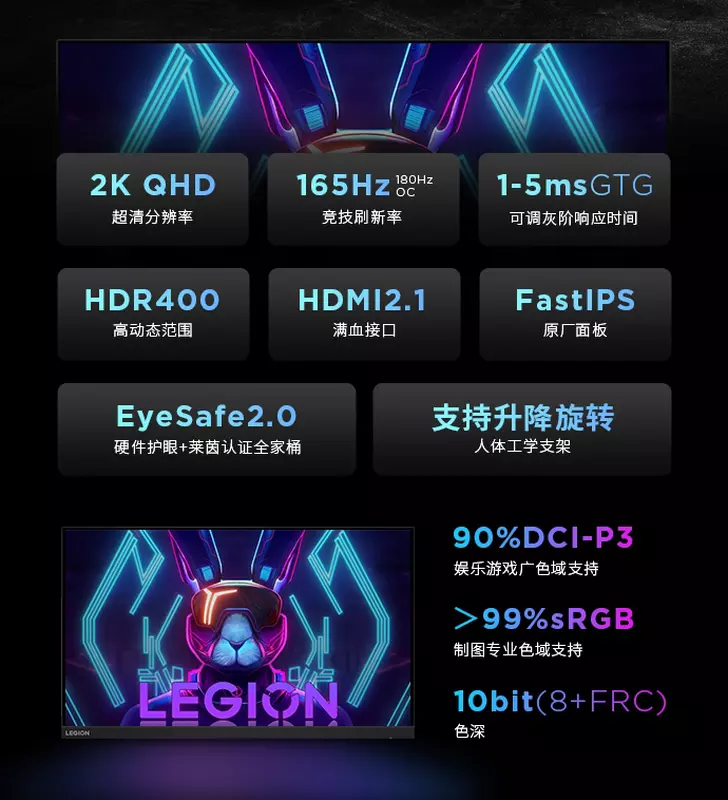 De nieuwigheid kreeg de naam Lenovo Legion R27q. De monitor heeft een 27-inch scherm met FastIPS matrix en QHD resolutie. Het paneel heeft 90% DCI-P3 kleurdekking en meer dan 99% sRGB dekking. De monitor heeft ook 10-bit kleurdiepte (8+FRC), HDR400 hoog dynamisch bereik, 1-5ms responstijd en ondersteuning voor verversingssnelheden tot 180Hz. Het nieuwe product is gecertificeerd door TÜV Rheinland. De monitor wordt geleverd met een verstelbare standaard en diverse poorten, waaronder HDMI 2.1.