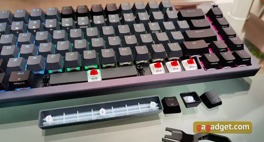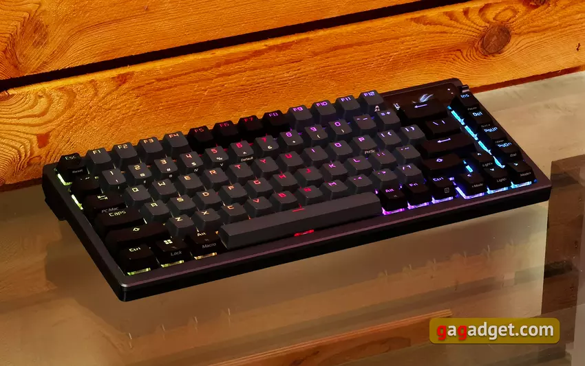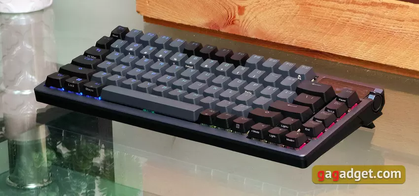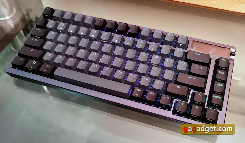 De indeling is een beetje ongebruikelijk, en dit geldt niet alleen voor de afwezigheid van een extra numeriek toetsenblok. Er zijn Ins, Del, PgUp, PgDn knoppen, ze bevinden zich verticaal aan de rechterkant en zijn lichtjes gescheiden van het hoofdtoestel. Het navigatiepijlenblok is ook apart geplaatst. Het staat iets dichter bij de gebruiker. De rechter Shift-, Alt-, Fn- en Ctrl-toetsen zijn korter en naar links verschoven. De linker Shift-, Ctrl-, Enter- en Backspace-toetsen zijn lang en hebben een standaardvorm. De F-functietoetsen hebben niet de standaardafstand en zijn duidelijk boven de corresponderende cijfers geplaatst. Het is dus even wennen als je het toetsenbord gebruikt om te typen of te werken. Alle belangrijke gamingtoetsen zitten op hun gebruikelijke plek.