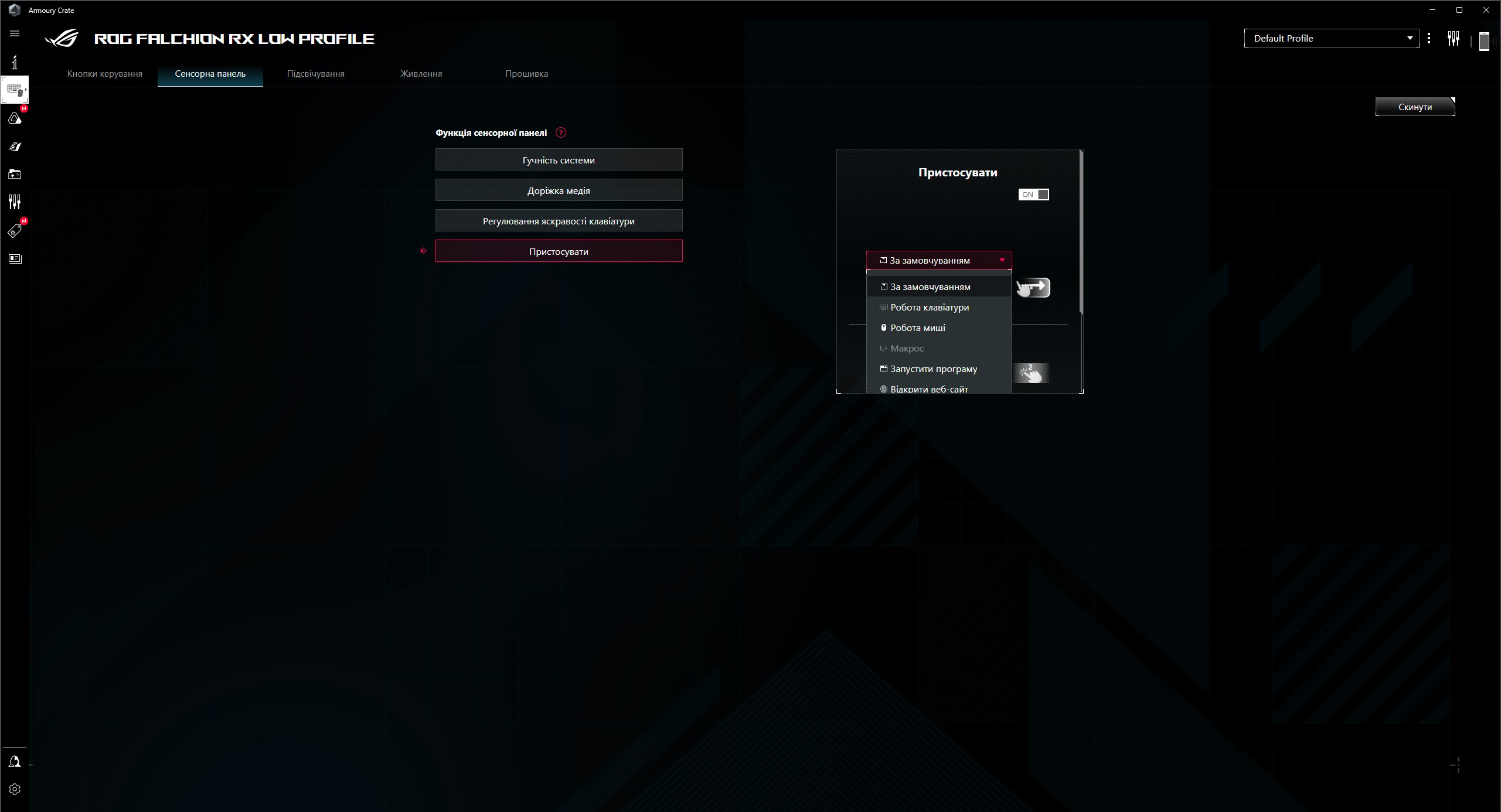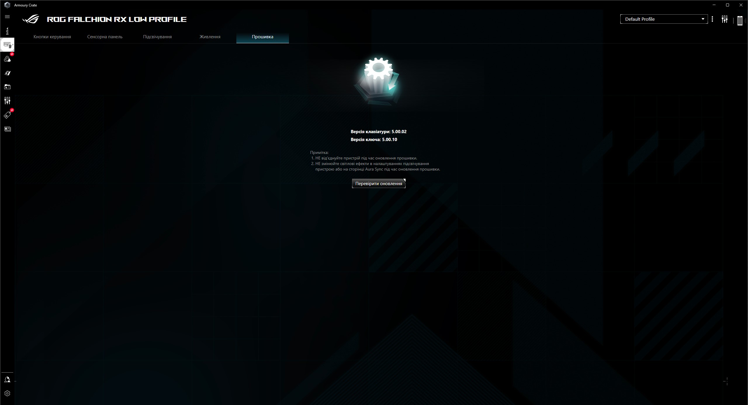 Om het toetsenbord volledig te configureren, gebruiken we de bekende Armoury Crate-applicatie voor alle ASUS gaming-apparaten. We hebben het er al vaak over gehad. Armoury Crate heeft een aparte sectie voor de ASUS ROG Falchion RX Low Profile, waar je acties voor individuele toetsen kunt configureren, profielen kunt opslaan, de achtergrondverlichting en energiebesparende instellingen kunt aanpassen en de firmware kunt updaten.
