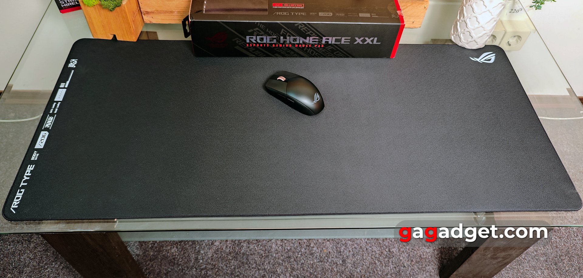 Samen met de ASUS ROG Strix Impact III Wireless zijn we gekomen om het ASUS ROG Hone Ace XXL gaming oppervlak te reviewen. Dit is het grootste oppervlak dat gg ooit heeft gezien en waarschijnlijk een van de grootste in het ASUS-assortiment. Het heeft afmetingen van 900x400mm, dus je kunt er gemakkelijk een muis, toetsenbord en monitor op kwijt. Of een muis met een laptop. Het oppervlak is zwart, met een minimum aan decoratieve elementen: een wit ROG-logo in de rechterbovenhoek en opschriften langs de linkerrand.