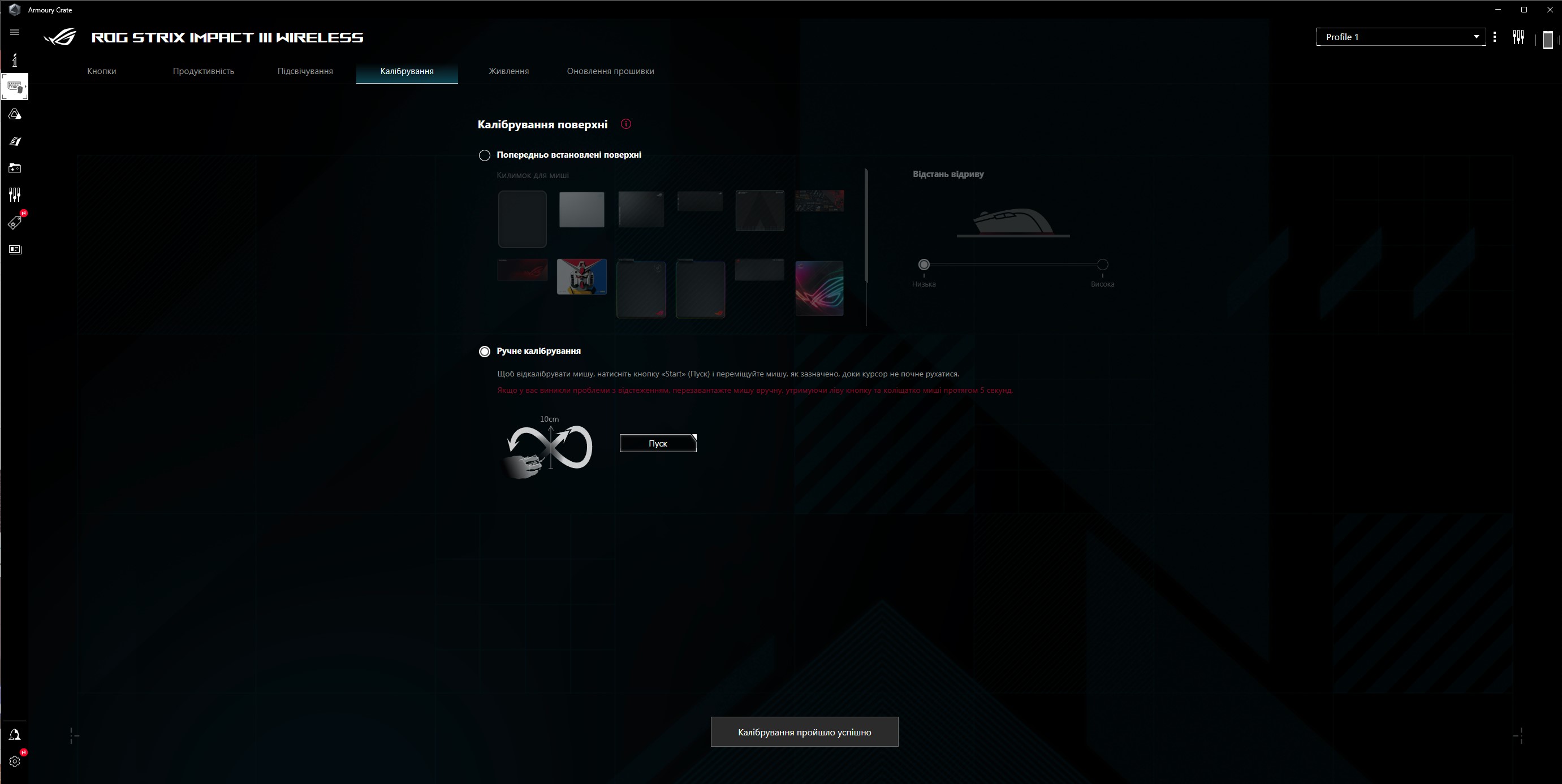 Om de ASUS ROG Strix Impact III Wireless volledig te configureren, moet u de eigen Armoury Crate software gebruiken. Bepaalde basisinstellingen kunnen echter onderweg worden gemaakt, dus er zullen geen problemen optreden wanneer u de muis aansluit op verschillende apparaten. De DPI-knop aan de onderkant van de muis is verantwoordelijk voor het schakelen tussen eerder geconfigureerde DPI-niveaus (het wiel licht even op in de corresponderende kleur). Voor een soepele aanpassing houd je de knop 3 seconden ingedrukt en pas je vervolgens de gewenste DPI aan met het scrollwiel. Om de hoogte van de lift van het oppervlak aan te passen, houd je de koppelingsknop en de extra knop aan de voorkant ingedrukt. Om de samplefrequentie te veranderen, gebruik je een combinatie van de Pair knop en de achterste extra knop. Door kort op de Pair knop te drukken schakel je met Bluetooth verbonden apparaten, en om over te schakelen naar de Bluetooth pairing modus moet je de knop 3 seconden ingedrukt houden. In de Armoury Crate app kun je acties configureren voor elke knop, vier DPI niveaus selecteren, polling frequentie, hoek binding, achtergrondverlichting (AURA sync ondersteuning is ook beschikbaar), lift-off hoogte en de muis kalibreren afhankelijk van het gebruikte oppervlak. Er zijn voorinstellingen voor ASUS-oppervlakken, maar ook kalibratie voor andere oppervlakken. Er is een energiegedeelte waar u het huidige oplaadniveau kunt bekijken, een alarm voor lege batterij kunt instellen en de tijd om te gaan slapen kunt instellen. De applicatie wordt ook gebruikt om de firmware bij te werken en tegelijkertijd een toetsenbord en muis aan te sluiten op één ROG Omni USB-zender.