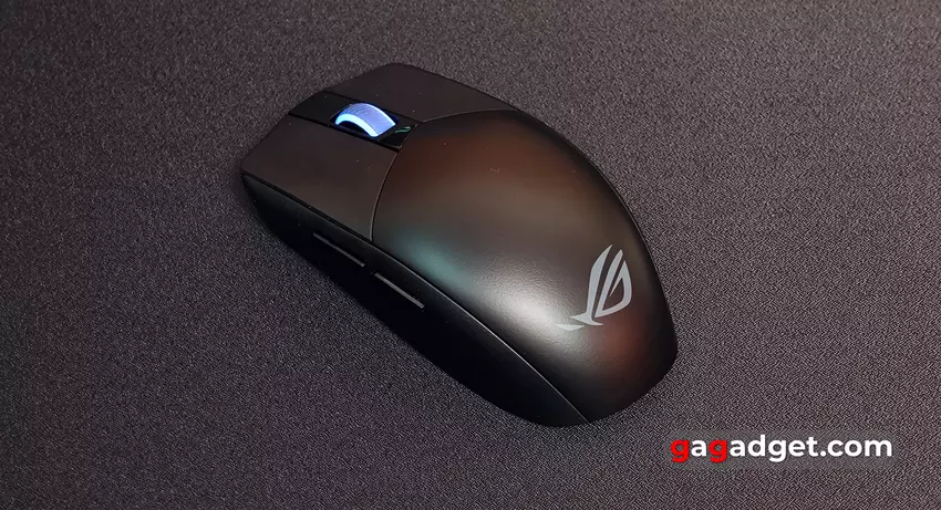 Ondanks de symmetrische vorm zitten de extra knoppen alleen aan de linkerkant van de muis, zodat je hem alleen met je rechterhand volledig kunt gebruiken. De knoppen zijn breed en hebben een duidelijke opening. Er zijn geen rubberen kussentjes; er zijn kleine diagonale inkepingen aan de voorkant van de zijkanten voor een betere grip. Aan de rechterkant staat het ROG logo.