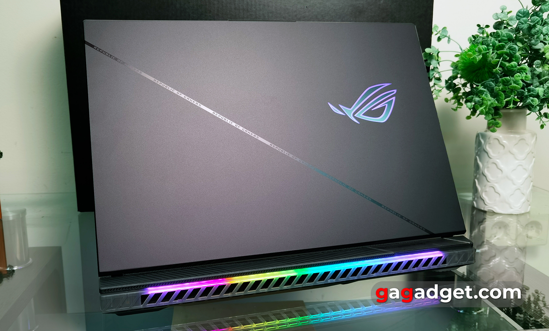 Het enige metalen element van de laptop is de bovenklep. Het is zwart met een matte afwerking, die ook zeer goed bestand is tegen vuil en vingerafdrukken. Eventuele gebruikssporen vallen niet op en kunnen heel gemakkelijk worden weggeveegd. Het deksel heeft ook een decoratieve diagonale lijn en natuurlijk het verlichte ROG-logo.