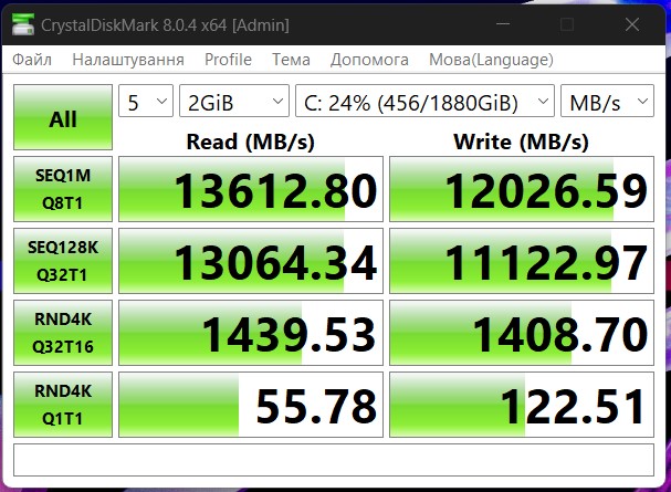 Dankzij het gebruik van RAID0 laat het schijfsysteem indrukwekkende snelheden zien die vergeleken kunnen worden met nieuwe, nog niet in massa geproduceerde PCIe Gen5 SSD's. In sommige gevallen kan de leessnelheid oplopen tot bijna 14.000 MB/s en de schrijfsnelheid tot ongeveer 12.000 MB/s.