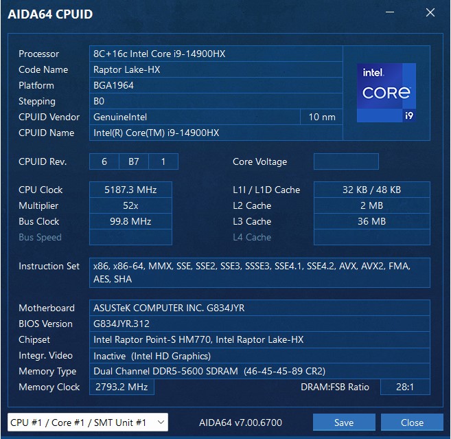 | Processor | Intel Core i9-13980HX (2,2-5,8 GHz), 24 (8+16) cores, 32 threads, (Raptor Lake, 14e generatie) |