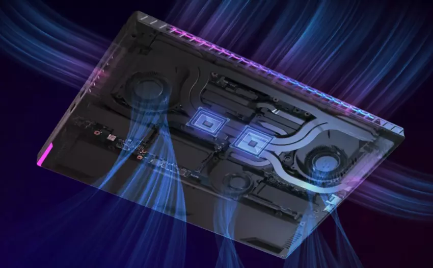 Het ROG Intelligent Cooling systeem is qua ontwerp vergelijkbaar met de ASUS ROG Strix SCAR van vorig jaar. Het bevat een enorme driedelige radiator met ventilatiegaten aan drie zijden van de laptop. De totale oppervlakte van de radiator vinnen is 195.509 mm², wat 82,5% groter is dan het Strix SCAR 17 2022 model. Er zitten drie ventilatoren in de laptop, waarvan er één de videochip en het videogeheugen blaast. Er zijn zeven heatpipes, en Conductonaut vloeibaar metaal wordt gebruikt als thermische interface op zowel de processor als de grafische chip.