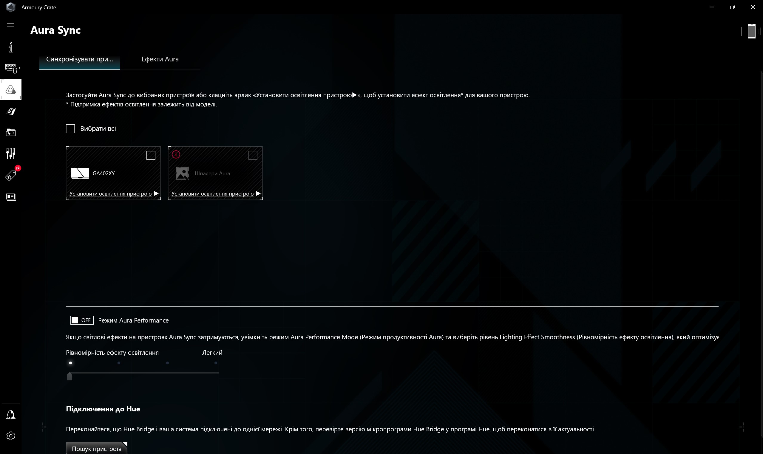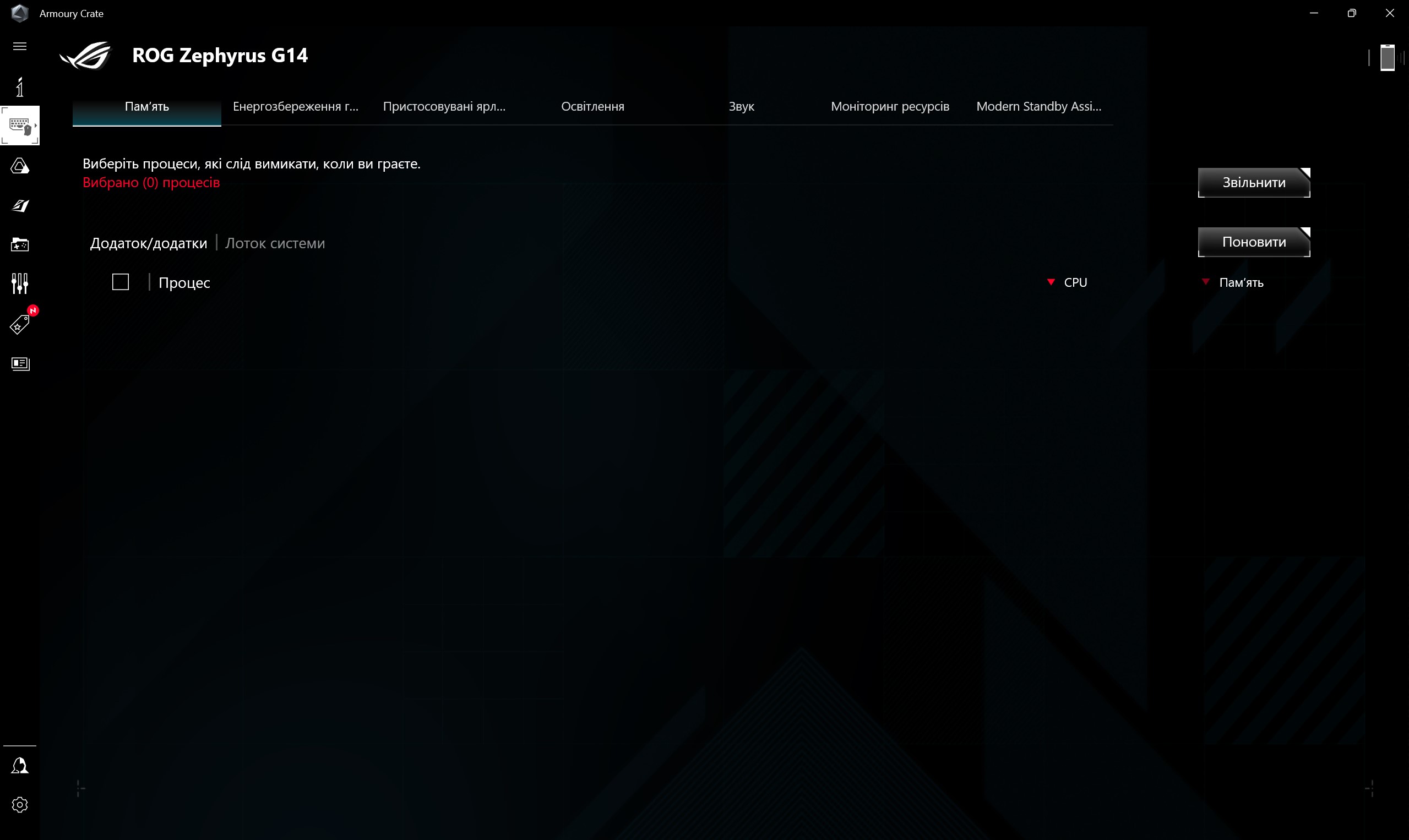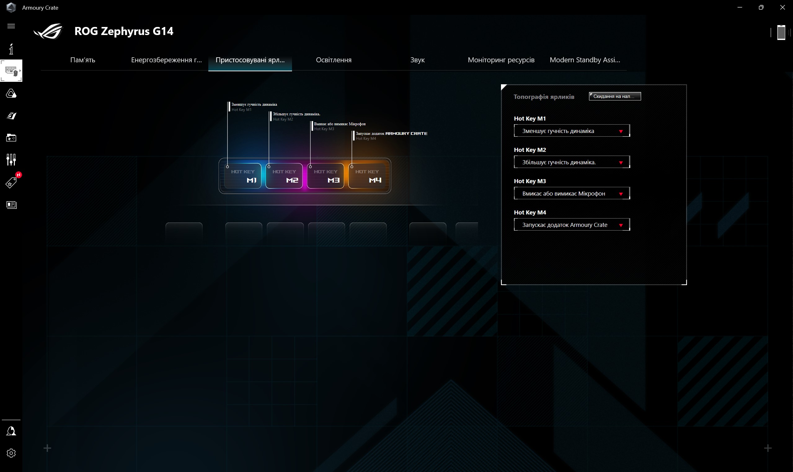 Bijna alle instellingen van de laptop, waaronder prestatieniveau, macro-instellingen, achtergrondverlichting, MUX Switch en scherm, worden gemaakt in de Armoury Crateapp.