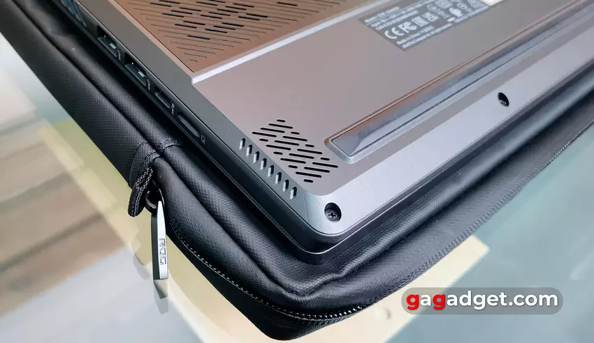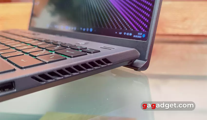 De ASUS ROG Zephyrus G14 (2023) is nauwelijks een ultrabook te noemen, gezien de dikte van 20,5 mm. Maar hij is echt compact in vergelijking met gaming modellen. Zeker met zulke krachtige componenten. De afmetingen zijn 312x227x20,5 mm en hij weegt 1,72 kg, dus je kunt hem gemakkelijk elke dag meenemen naar kantoor. De laptop is van hoge kwaliteit en de panelen buigen nauwelijks.