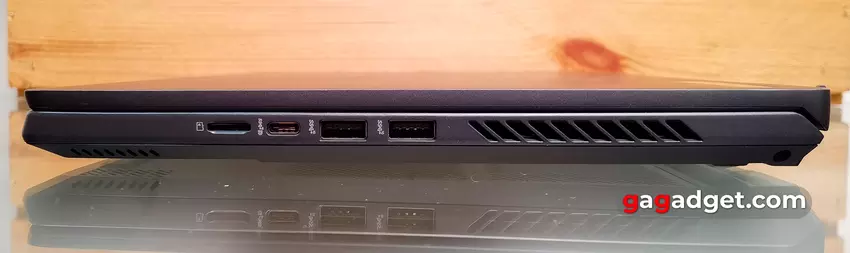 Aan de rechterkant zitten USB 3.2 Gen2 Type-C met Display Port 1.4 G-Sync, 2xUSB3.2 Gen2 Type-A, een microSD-kaartlezer (UHS-II) en nog een gebied met ventilatieopeningen.